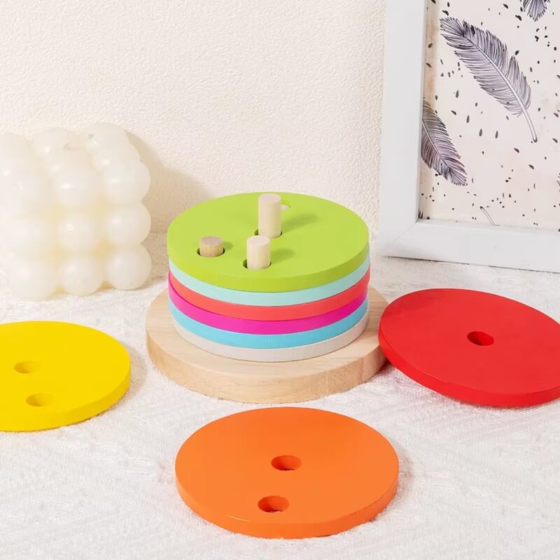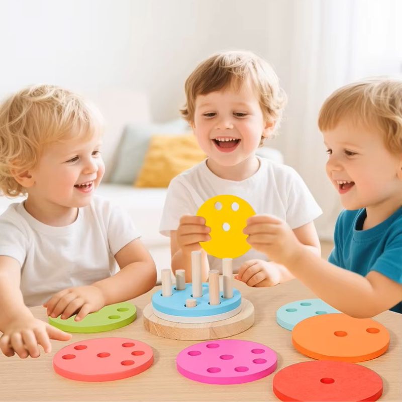 A különböző lyukakkal ellátott korongok és az eltérő magasságú oszlopok gondolkodásra késztetik a gyermeket – így minden sikeresen felépített torony egy igazi kis győzelem! 🎯